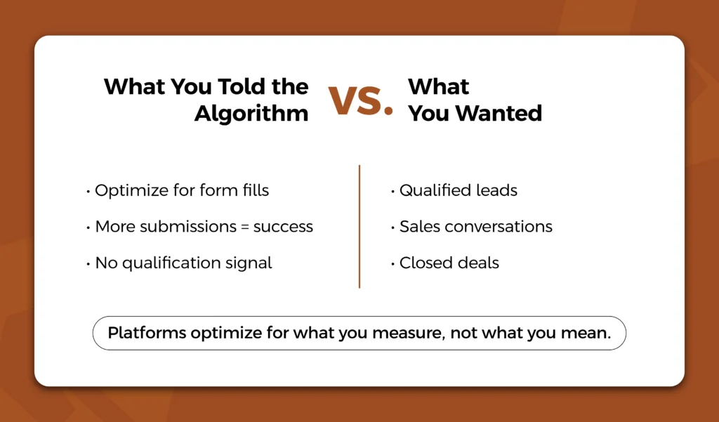 From the platform’s perspective, that’s the goal. It will go out and find more people who are likely to complete that action. The problem is that not all form fills are equal. Some represent real potential customers, while others are unqualified, low-intent, or even automated spam.