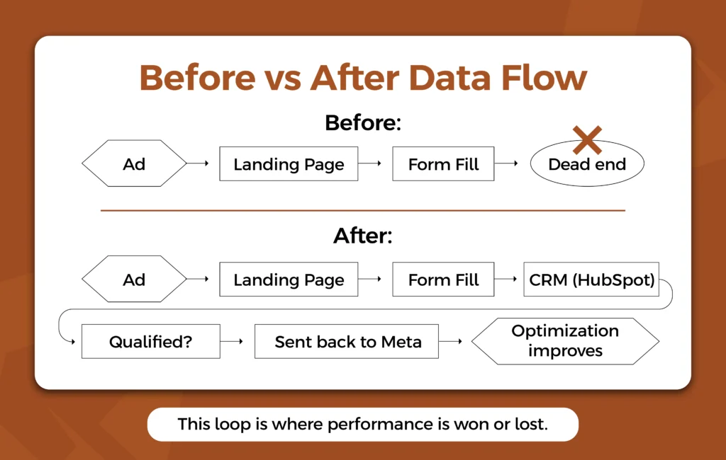 The first was connecting the client’s CRM data back into Meta through offline conversion tracking. They were using HubSpot, but none of that downstream information—like whether a lead was qualified or moved forward—was being fed back into the platform. Once that connection was in place, Meta could begin optimizing toward leads that actually resembled customers, rather than just anyone who filled out a form.